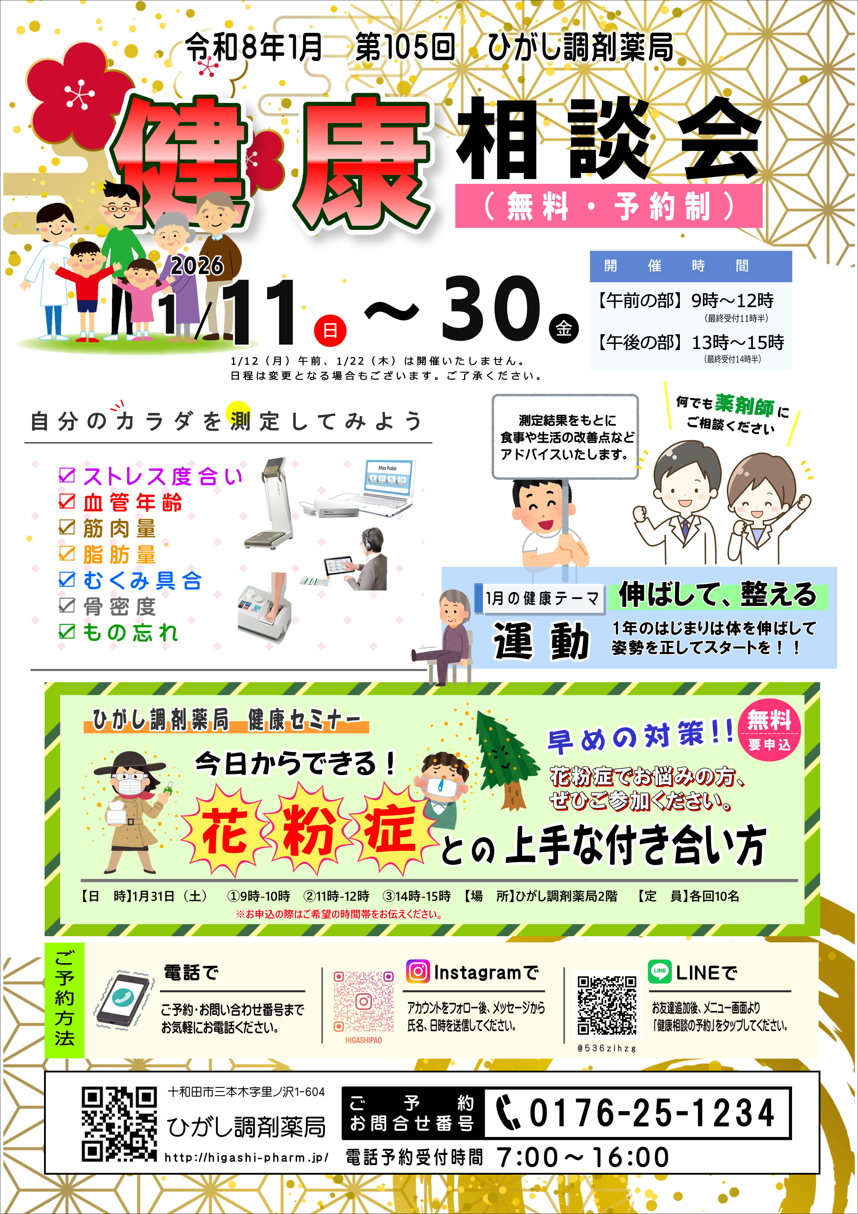 みなさまの健康づくりをお手伝いする、ひがし調剤薬局恒例の「第105回 健康相談会」 を開催いたします。年末年始の食べ過ぎ・飲み過ぎをリセットする為にもご自分のカラダチェックしてみませんか??